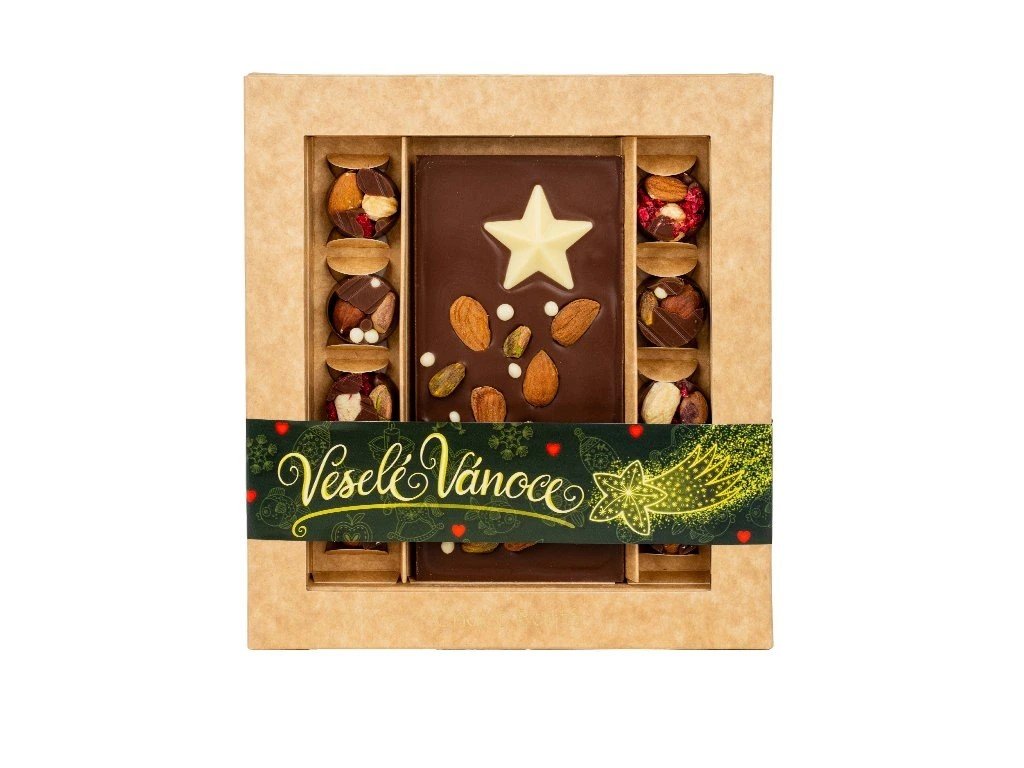 Připravte se na sladký adventní čas s dárkovou čokoládou v mléčné verzi, doplněnou o 8 ručně vyráběných bonbonů z mléčné čokolády s oříšky a lyofilizovanou malinou. Čokoláda je pečlivě dekorovaná a balená v elegantní dárkové kazetě, která potěší každého milovníka kvalitní čokolády. Skvělý vánoční dárek pro ty, kteří ocení kombinaci mléčné čokolády a luxusního provedení.