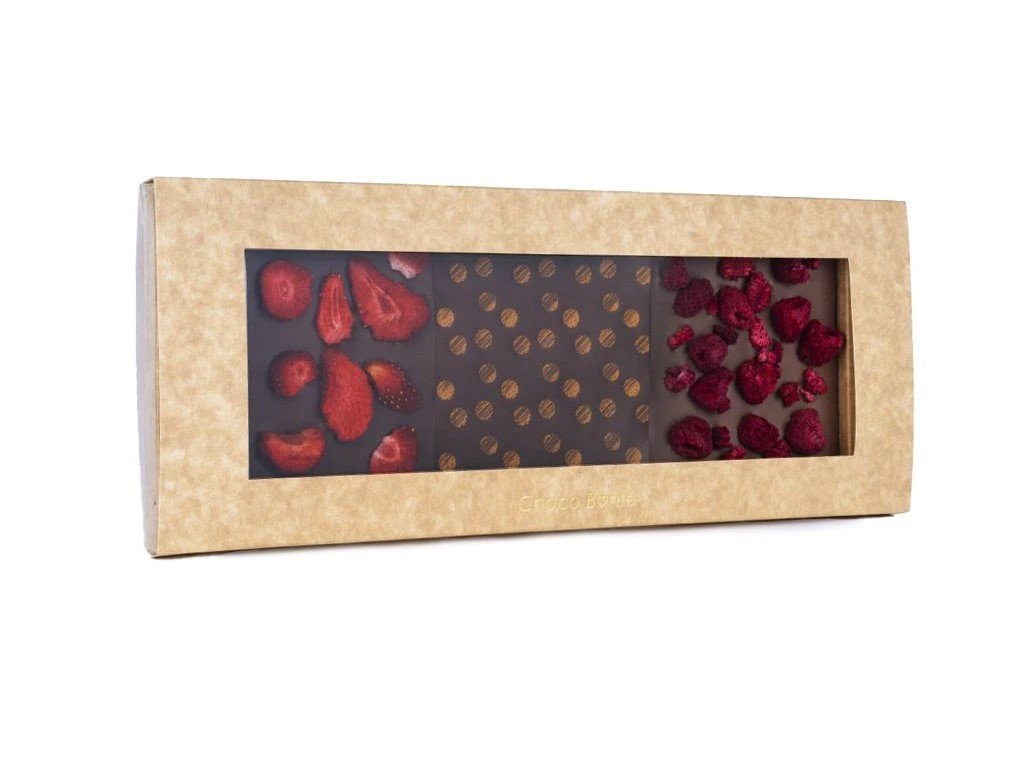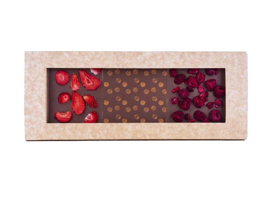 Choco Bonte Mléčná čokoláda s jahodami, malinami a zdobením - 3 čtverečky