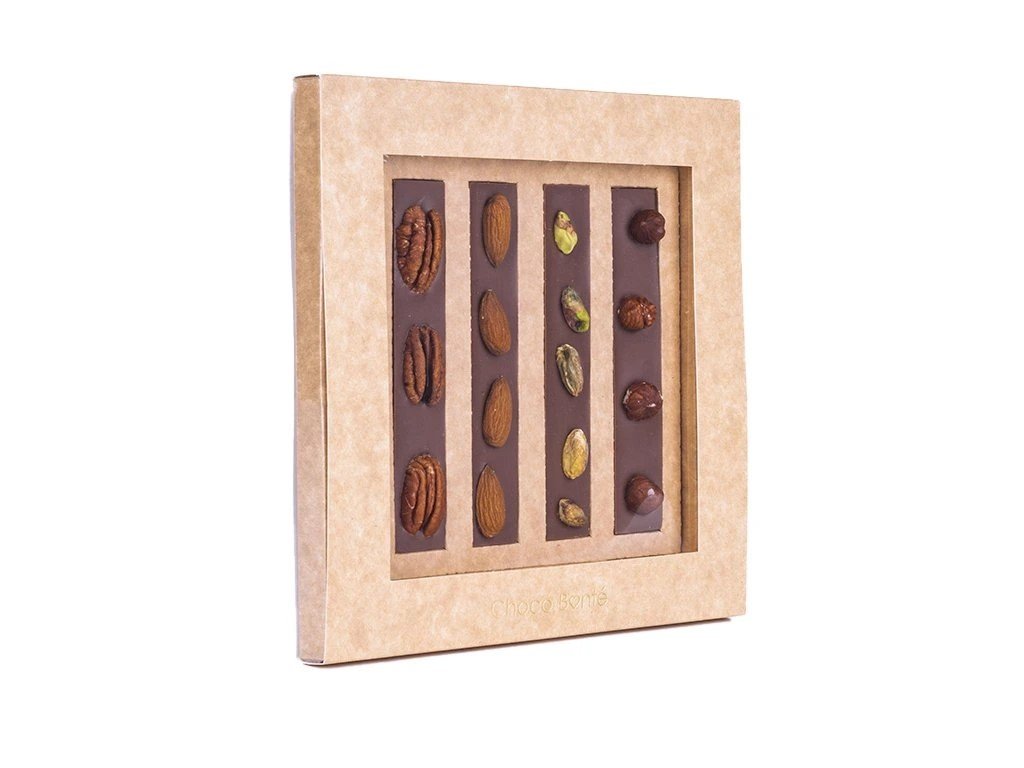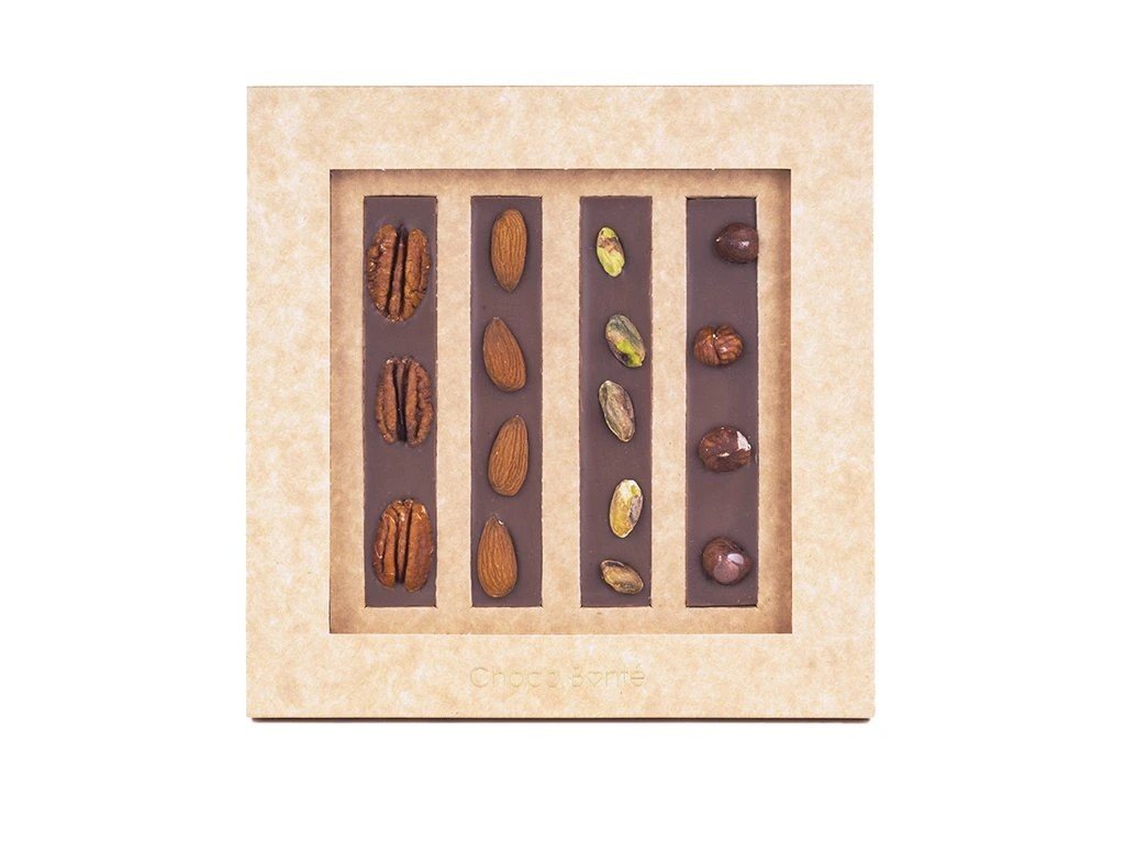 Objevte dokonalou souhru jemné mléčné čokolády a výběrových ořechů - pistácií, lískových oříšků, mandlí a pekanů. Každý z těchto čtyř ručně litých pásků je originál, vytvořený s péčí a důrazem na kvalitu. Křupavé ořechy v kombinaci s čokoládou tvoří harmonii chutí, která potěší každého milovníka sladkého.