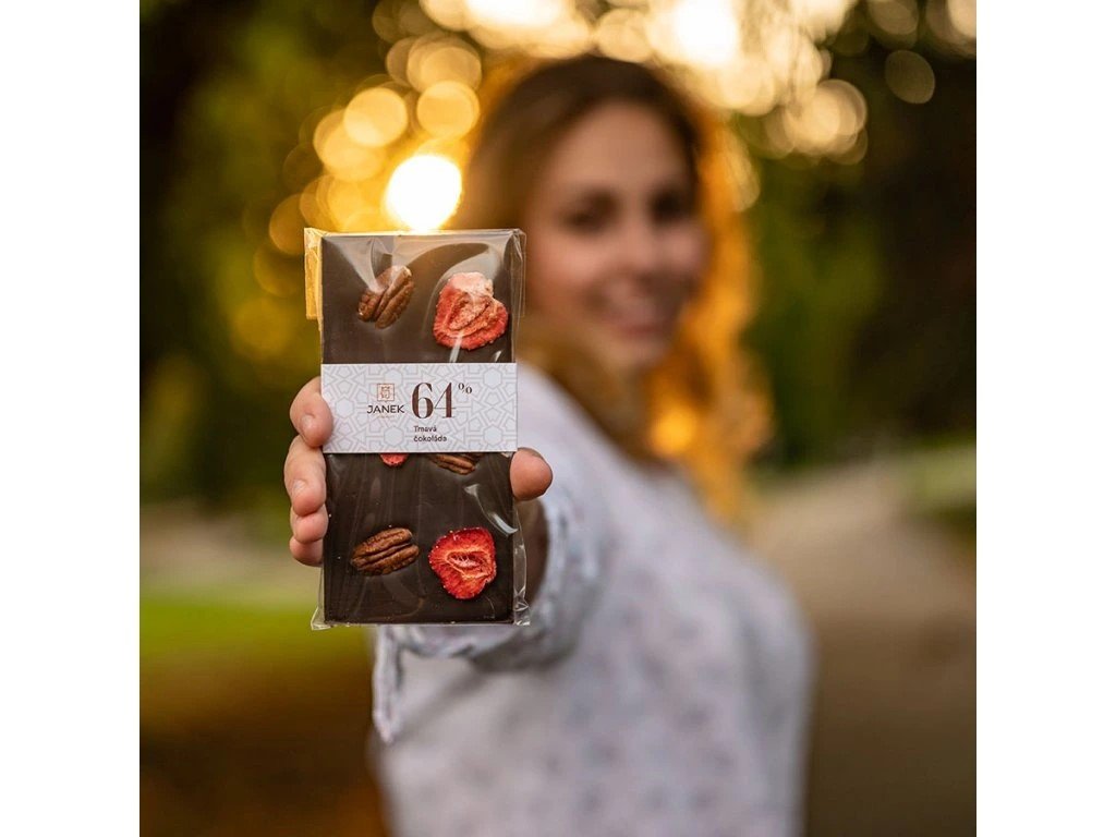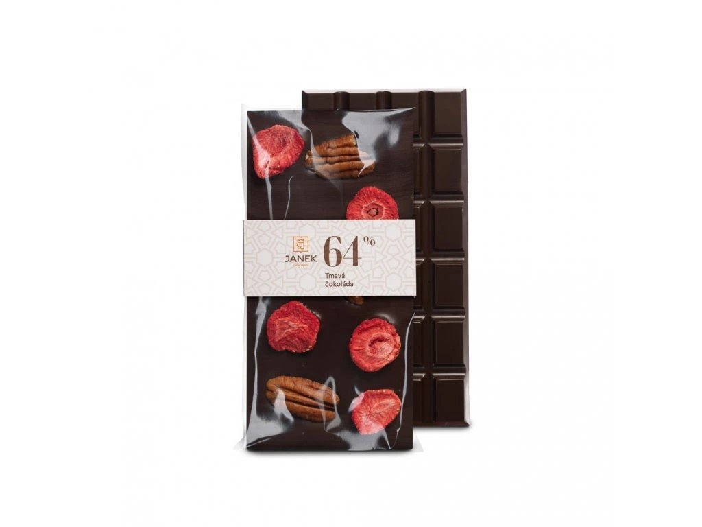 JANEK Hořká čokoláda s pekanovými ořechy a jahodami