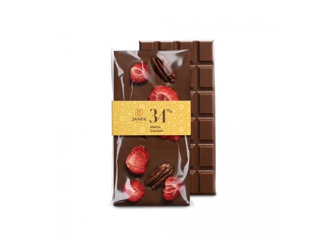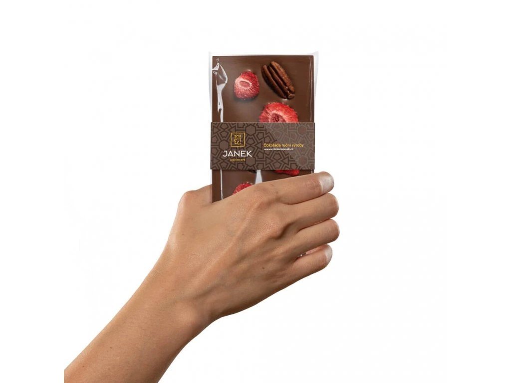 JANEK Mléčná čokoláda s pekanovými ořechy a lyofilizovanými jahodami