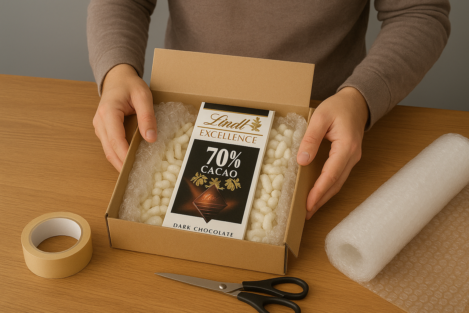 - Pevnou papírovou krabici vyložíme další bublinkovou fólií , aby v krabici pevně drželo a nehýbalo se. Když je třeba, použijeme další výplň.