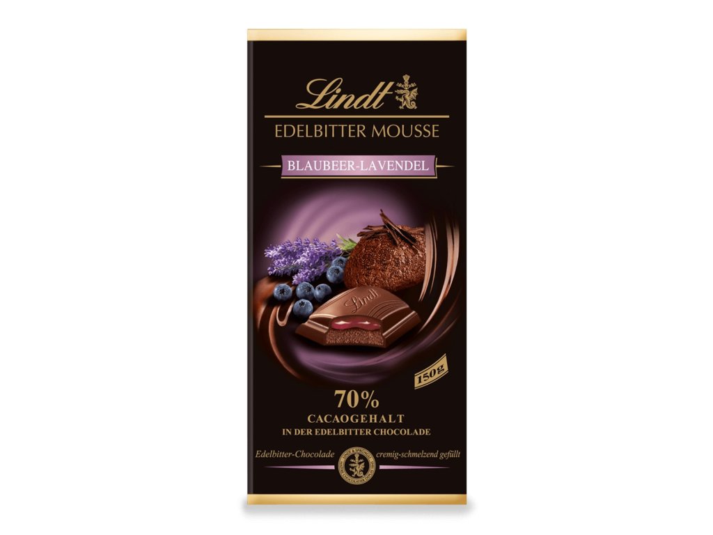 | Lindt: | hořká čokoláda, 70%, borůvky, levandule |