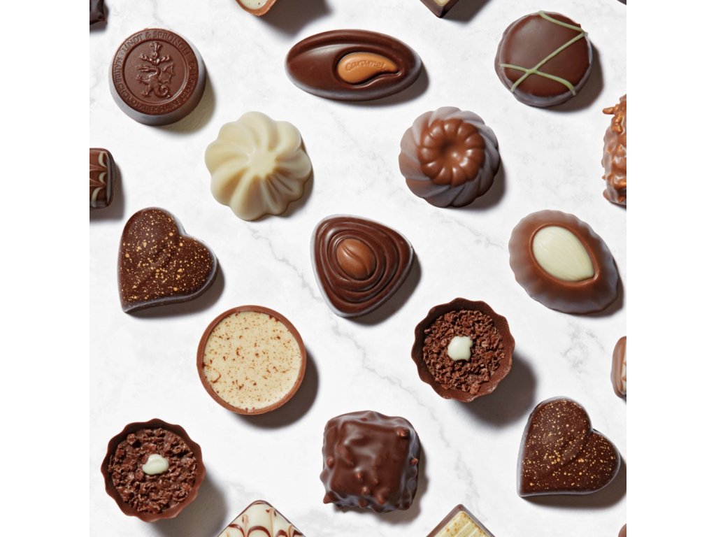cukr, kakaové máslo, sušené plnotučné mléko, kakaová hmota, lískové ořechy, mandle, bezvodý mléčný tuk, sušené odstředěné mléko, glukózový sirup, dextróza, laktóza, citrónová kůra, pomerančová kůra, sirup z invertního cukru, Marc de Champagne, pistácie, glukózo - fruktózový sirup, emulgátory: sójový a slunečnicový lecitin, plnotučné mléko, sušená smetana, alkohol, pšeničná mouka, třešňovice, káva, přírodní aromata, extrakt z ječného sladu, aromata, zvlhčující látka: invertáza, smetana, jedlá sůl, kakaový prášek se sníženým obsahem tuku, koncentrát citrónové šťávy, přírodní pomerančové aroma, kokosový tuk, regulátor kyselosti: kyselina citronová, lešticí látka: arabská guma, sirup z karamelizovaného cukru. |