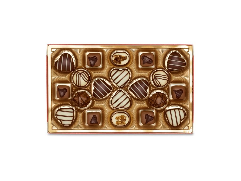 cukr, mandle, kakaové máslo, sušené plnotučné mléko, kakaová hmota, sirup z invertního cukru, vlašské ořechy, lískové ořechy, sušené odstředěné mléko, alkohol, laktóza, citrónová kůra, pomerančová kůra, kakaový prášek se sníženým obsahem tuku, rýže, glukózo-fruktózový sirup, emulgátory: sójový lecitin, pšeničné klíčky, pšeničný škrob, zvlhčující látka: invertáza, dextróza, přírodní aromata, jedlá sůl, aromata, regulátor kyselosti: kyselina citrónová, přírodní pomerančové aroma. |