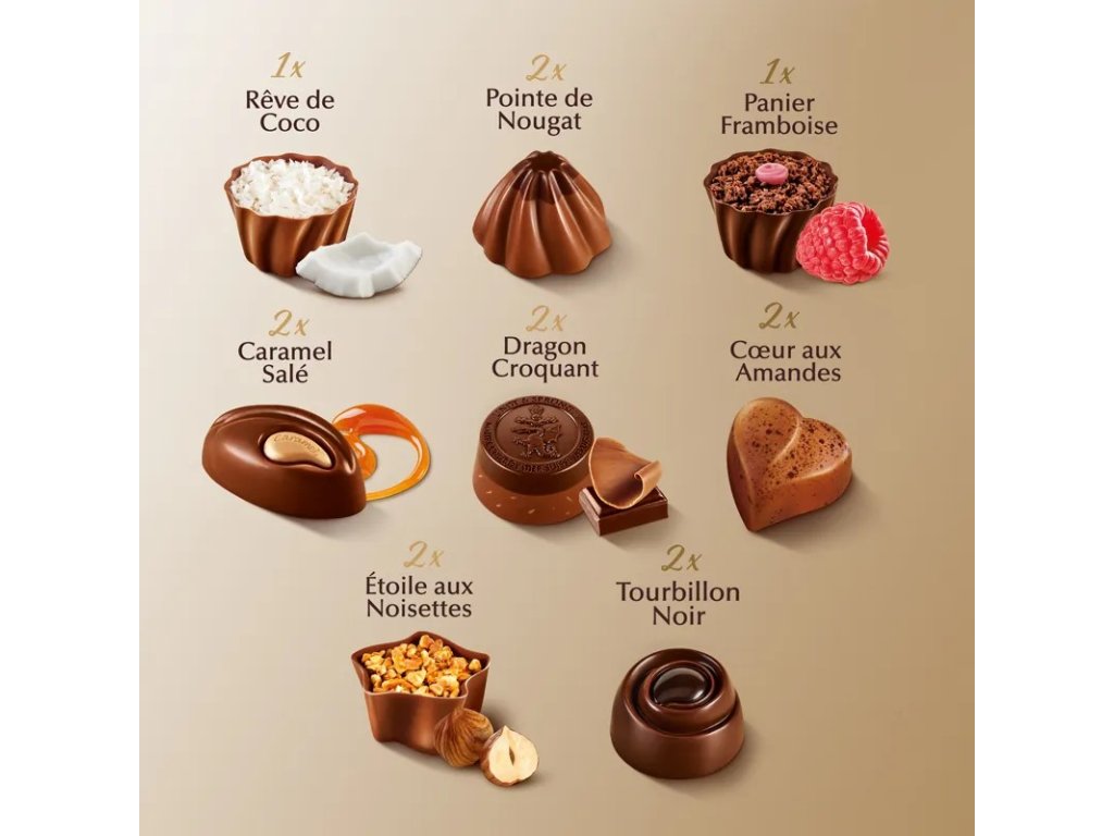 cukr, kakaová hmota, kakaové máslo, sušené plnotučné mléko, mandle, rostlinný tuk (palmový, kokosový, palmojádrový, shea a slunečnicový v různém poměru), bezvodý mléčný tuk, laktóza, sušené odstředěné mléko, slazené kondenzované mléko, jádra lískových ořechů, glukózový sirup, máslo, smetana, zvlhčující látka (sorbitol sirup), emulgátor: sójový a slunečnicový lecitin; rýžová mouka, kakaový bob, pomerančová dužina, extrakt z ječného sladu, káva, aromata, pšeničná mouka, glukózo-fruktózový sirup, koncentrát z pomerančové šťávy, barviva (kurkumin, paprikový extrakt, annatto), kakaový prášek se sníženým obsahem tuku, kakaový prášek, vaječný bílek, pufovaná rýže, jedlá sůl, přírodní citrusové extrakty, stabilizátor (trifosforečnany), regulátor kyselosti (kyselina citronová), mléčná bílkovina, pšeničný škrob, kypřicí látka ((uhličitany sodné), antioxidant (extrakt s vysokým obsahem tokoferolů), leštící látka (šelak), želírující látka (arabská guma). |